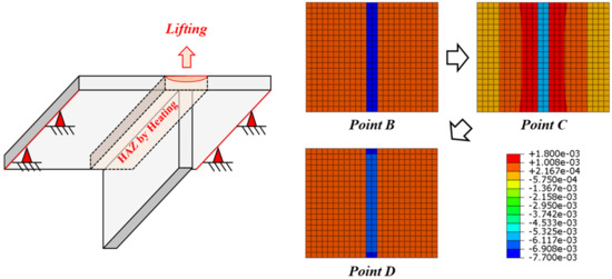 This effect was confirmed using a model in which the flat plate and girder were connected (Figure 9). Both corners of the flat plate were fixed, and a load by lifting acted on the line heating area. The simulation showed that the inherent strain of the line hating area was reduced due to the lifting load (Point B→Point C). The reduced inherent strain did not recover even after the lifting load is removed (Point C→Point D). In calculating the line heating efficiency, the phase transformation due to heating and cooling was considered.