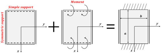As shown in Figure 11, the result of fixed support can be identified by using the superposition of the result of an acting moment () on the edge and the result of being simply supported. Because the solution for the simple support was already obtained, only the results of the moments acting on the top and bottom edges had to be acquired. When the moment acts on the top and bottom edges, the boundary conditions are defined in Equation (25) and a solution satisfying the boundary condition is defined by Equation (26).