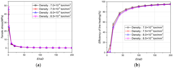 Tensile stress and line heating efficiency by stiffness ratio of plate and beam according to the density of the plate. (a)Tensile stress by density of the plate; (b) Line heating efficiency by density of the plate.