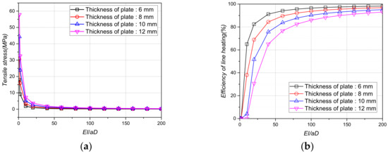 Tensile stress and line heating efficiency by stiffness ratio of plate and beam according to the thickness of the plate. (a) Tensile stress by thickness of the plate; (b) Line heating efficiency by thickness of the plate.