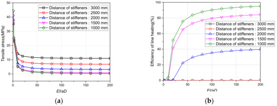 Tensile stress and line heating efficiency by stiffness ratio of plate and beam according to distance of stiffeners. (a)Tensile stress by thickness of the plate; (b) Line heating efficiency by distance of plates.