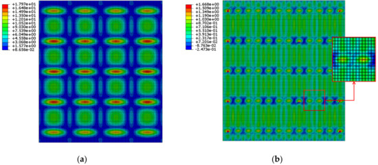 The ship block model shown in Figure 15 was used to confirm the results of the local model. The length and width of the ship block model are 12 m and 15.6 m, respectively, and the height is 1.8 m. The thickness of the plate, made of carbon steel, excluding the stiffener was 10 mm. The finite element model was constructed using the S4R element to perform deformation analysis of the ship block caused by the lifting process. In the case of without stiffener, the tensile stress of the plate in the ship block is up to 17.97 MPa as shown in Figure 16a. It can be inferred that the calculated stress effect is greater than the tensile stress, and hence, the correction effect of line heating has completely disappeared owing to the lifting process. Figure 14b shows that the stiffness ratio between the plate and the stiffener should be 50 to maintain the line heating efficiency at 80%, and the thickness and height of the stiffener were determined to be 10 mm and 255 mm, respectively. A deformation analysis was performed on the ship block model with a stiffener, and it was confirmed that the maximum stress of the plate was 1.135 MPa, except at the location of stress concentration due to the connection of the lifting wire. The line heating efficiency calculated using the obtained stress was 78.61%, which was similar to the results of the local model.