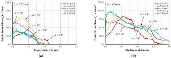 Figure 2a,b show the tensile stress-displacement curves belonging to the embedded length of 3.25 mm (a) resp. 6.50 mm (b). The tensile stress-displacement curves are figured as mean values (mv) calculated from three individual test curves. For this purpose, a unit displacement axis with 0.02 mm steps between 0.0 and 8.0 mm is set up. For each displacement step, the relating tensile stress per fibre is searched from the three individual test curves.
