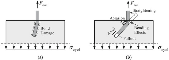 Damage processes of inclined fibres that might occur after cyclic loading: (a) Bond damage at an orientation of approximately 75° and (b) fibre damage at an orientation of approximately 45°.