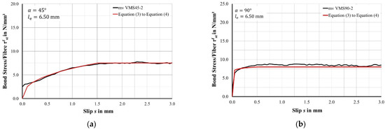 Experimental bond stress-slip relationship and analytical bond stress-slip relationship according to Equations (3) and (4): (a) Fibre orientation angle at 45° and (b) fibre orientation angle at 90°.