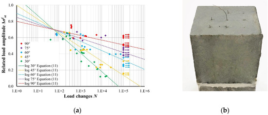 Equation (11) gives the opportunity to describe the fatigue behaviour of embedded steel fibres in UHPFRC considering the load amplitude, number of load changes, and fibre orientation . Equation (11) is only valid for the UHPC and fibre type used in this study. The extension of Equation (11) to other concrete and fibre material requires tailored experimental and theoretical investigations.