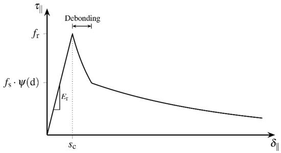 stands for the ultimate bond stress and is a parameter that describes the bond stiffness. Parameter is the slip of the fibre and parameter marks the relative displacement, at which point the maximum bond strength occurs. After reaching the ultimate bond strength, the analytical bond stress-slip relationship proceeds horizontal at the level of the ultimate bond strength . Equation (4) shows the formulae for the horizontal course: