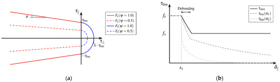 Therefore, the bond capacity is defined in accordance with the different bond phases and takes into account the degradation of the bond zone. The process of debonding presumes increasing damage. Unloading of the bond zone cannot restore the initial rigid bond behaviour due to adhesion, if debonding of the contact surfaces has started. Thus, the irreversible change in bond capacity is modelled as a function of damage. Figure 9b schematically represents a possible evolution of the bond capacity when varying the model parameter , that scales the damage growth and therefore implicitly takes into account the effects of degradation, see Equation (22).