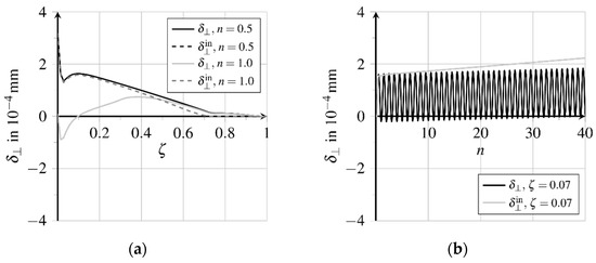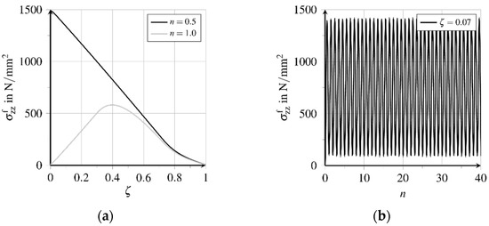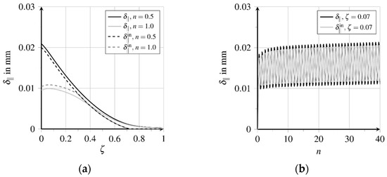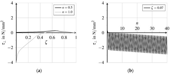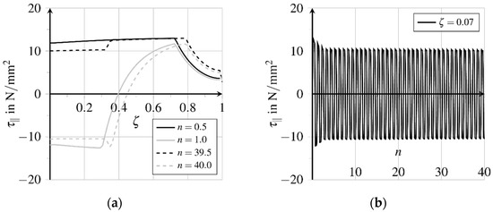 Bond zone damage increases almost linearly here, see Figure 13b. Due to the chosen formulation of the damage evolution potential , see Equation (22), and a constant rate of the inelastic relative displacement flattening of the course of bond zone damage evolution can be expected at higher numbers of load cycles. Because of the change of the movement direction, both the matrix and fibre surface are polished and smoothened, cf. [33]. Weakening the bond zone results in fatigue and finally, failure with progressive fibre pullout, cf. [33]. The comparison of the distributions of the bond shear stresses indicates a shifting of the different bond zone areas regarding maximum loading and unloading times of the first and 40th load cycle respectively, see Figure 14a. The displacement courses presented in Figure 12a show a sign change of the course of elastic relative displacements and the related bond shear stresses at , see Figure 14a. The bond zone experiences a reversed shear loading from the fibre outlet to , which induces a reversed inelastic relative displacement evolution at simultaneously increasing bond zone damage , see Figure 13b. Simultaneously, the absolute amount of inelastic slip is reduced in this area.
