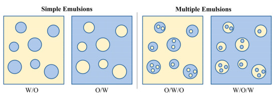 Emulsion is generally a liquid dispersion consisting of two or more immiscible liquids. Water and oil are two common liquids that can form various forms of emulsions, including binary water-in-oil (W/O) or oil-in-water (O/W) emulsions and multiple oil-water-oil (O/W/O) and water-oil-water (W/O/W) (Figure 2). The O/W emulsion is the most common form of PCM emulsions. Apart from oil and water, an emulsifier is needed to form a stable emulsion. The emulsifier is usually a surface-active agent which reduces the interfacial tension (γ), lowering the free energy (ΔG), as given by [22].