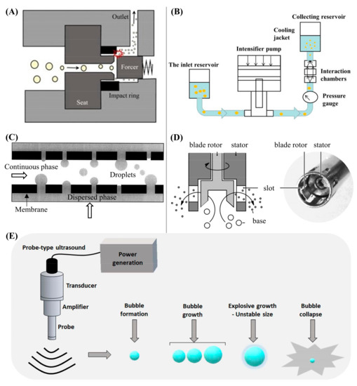 Illustrations of high-energy methods. (A) High-pressure homogenization (Reproduced with permission from Ref. [38]. Copyright 2016 Elsevier); (B) High-pressure microfluidization Reproduced with permission from Ref. [39]. Copyright 2020 Elsevier); (C) Membrane emulsification [40]; (D) Rotor-stator homogenization (Reproduced with permission from Ref. [41]. Copyright 2016 John Wiley and Sons); (E) Ultrasonic emulsification (Reproduced with permission from Ref. [42]. Copyright 2020 Elsevier).