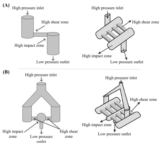 Two geometries of interaction chamber in high-pressure microfluidizer. (A) Z-type with single and multiple channels; (B) Y-type with single and multiple channels (Reproduced with permission from Refs. [50,51]. Copyright 2018 and 2016 Elsevier).