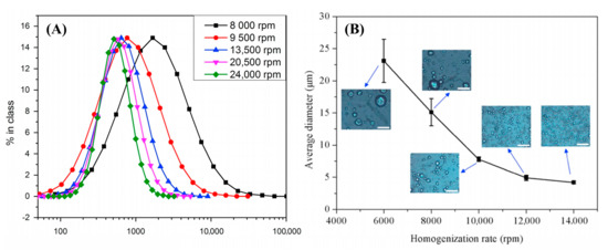 Zhang et al. [72] and Wang et al. [73] also evaluated the effect of rotation speed on emulsification of paraffin PCM (Figure 5). For relatively large droplet size dispersion, the increase of rotation speed could effectively lower the size from 24 to 4 μm. However, when the particle size had already reached to about 1 μm, a further reduction could be hardly achieved by a higher rotation speed up to 24,000 rpm. The reason has been stated in the above section due to the limit of rotor-stator homogenizer. Under this circumstance, a higher surfactant content is required to obtain a smaller particle size.