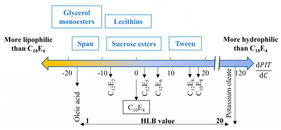 - Ontiveros, J.F.; Pierlot, C.; Catté, M.; Molinier, V.; Salager, J.-L.; Aubry, J.-M. A simple method to assess the hydrophilic lipophilic balance of food and cosmetic surfactants using the phase inversion temperature of C10E4/n-octane/water emulsions. Colloids Surf. A Physicochem. Eng. Asp. 2014, 458, 32–39. [Google Scholar] [CrossRef]
