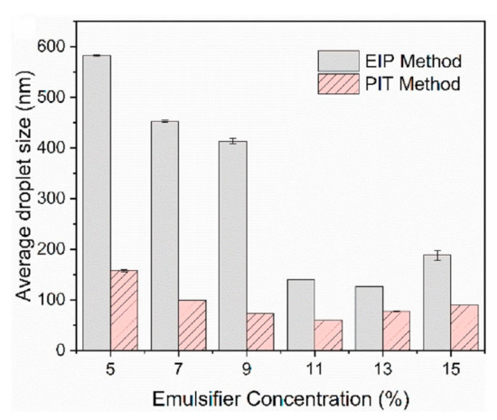 According to Equation (1), higher free energy is required for the formation of emulsions with smaller droplet sizes. With the high-energy methods, the mechanical energy increases sharply with the droplet size reduction. For example, the low-energy shaking with hand is sufficient to produce oil in water emulsions with a droplet size of 40–100 μm, but a huge amount of energy approximately in the order of 108–1010 W/kg [37] would be required to produce nano-sized droplets.