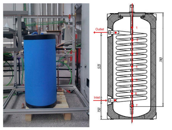 - Delgado, M.; Lázaro, A.; Mazo, J.; Peñalosa, C.; Marín, J.M.; Zalba, B. Experimental analysis of a coiled stirred tank containing a low cost PCM emulsion as a thermal energy storage system. Energy 2017, 138, 590–601. [Google Scholar] [CrossRef]