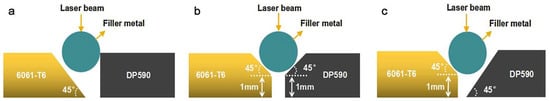 The work [25] presents a technology in which a laser beam was directed to a filler wire, which in the molten state interacts with DX51D steel and AlMgSi1 alloy. The authors chose the double-flanged and lap configuration, in this case, the edges being joined by a laser beam do not melt.