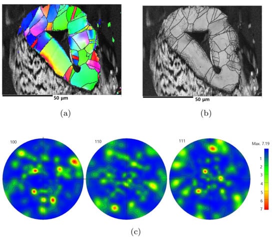 Electron microscope images of the cross section of a strut of Specimen 1: (a) inverse pole figure (IPF) map, (b) image quality (IQ) map, and (c) pole figures (PFs). Contours of pole figures: 0.65, 1.05, 1.45, 1.85, 2.25, 2.65.