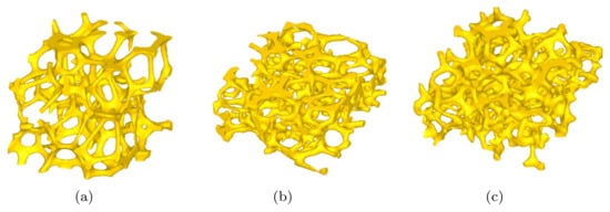 For a numerical analysis, reconstructed microstructure based on X-ray CT was discretized. In fact, it would be most reasonable to directly model the hollow grain structure observed in Figure 1. For 3D reconstruction based on X-ray CT, the hollow strut of the Ni foams is still difficult to handle. Instead, the solid strut thickness was adjusted to model the microstructure. The solid volume of model domains was decreased, or the porosity was increased, considering the hollow structure inside struts. The adjusted model domains were verified based on predicted mechanical responses.