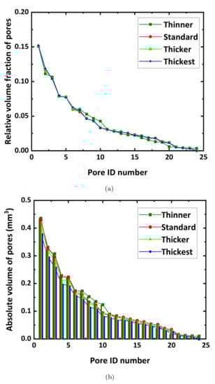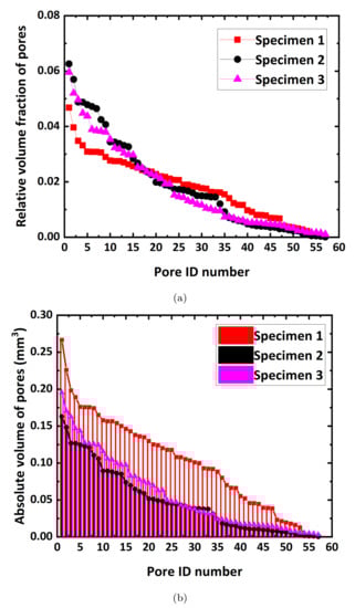 (a) Relative volume fraction (RVF) of pores, and (b) absolute volume (AV) of pores in the microstructures, as shown in Figure 2.
