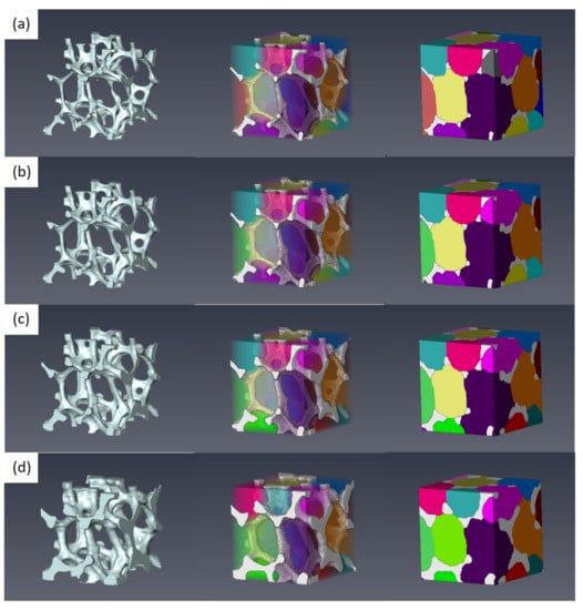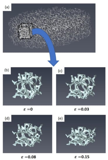 Numerous factors affect the mechanical properties of metal foams, such as porosity, pore size, pore shape, pore connectivity, etc. It is difficult to experimentally control each microstructural feature individually. A virtual specimen based on the model domain obtained from micro-CT was utilized to easily control the microstructural features mentioned above. Three different models were generated through control of the strut thickness, using a part of Specimen 1 (standard model). The three models possess thinner, thicker and the thickest struts, compared to the starting standard model. All four models created are presented in Figure 4. The starting standard model is given in Figure 4b, and the other three models with thinner, thicker, and the thickest struts are presented in Figure 4a,c,d, respectively. The morphological shape and connectivity of pores are similar to each other. Table 3 summarizes microstructural features of four different model domains. With an increase in the average strut thickness, both the porosity and average slenderness ratio decrease.
