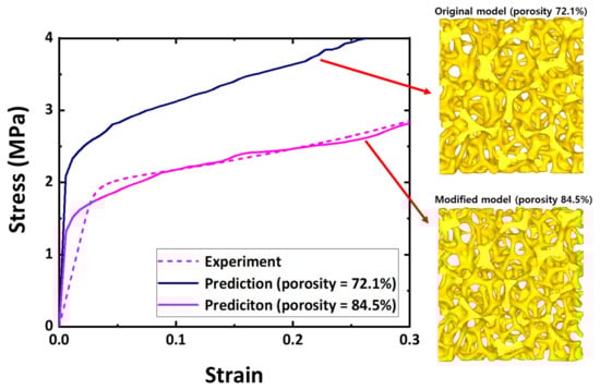Microstructure obtained from X-ray CT underestimated the porosity of the model domains because the hollow structure in the center of the struts was not considered. Figure 6 illustrates two different microstructures of Specimen 3 with different porosities, and their predicted strain–stress distributions were compared to an experimental result. Each microstructure model for Specimen 3 was generated in a similar manner, as discussed in Figure 4, and thus, they possessed a similar pore distribution. The original microstructure model with a porosity of 72.1% overestimated the flow behavior, compared to the experimental result. The flow behavior of the modified model with increased porosity of 84.5% closely matched that of the experiment. Porosity modification to reflect the hollow structure of the struts thus appears to be reasonable. The original microstructure domain was selected to reasonably represent pore and strut distributions of the Ni foams.