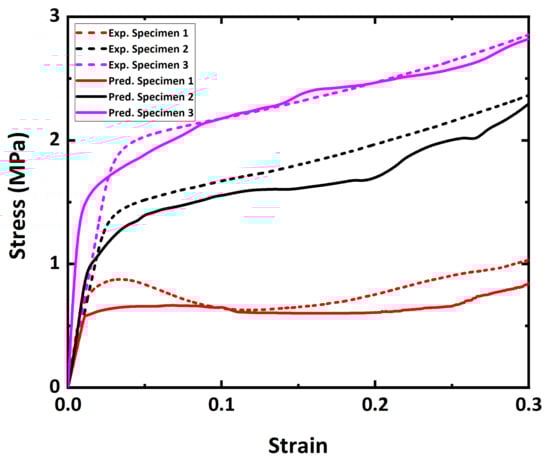 Both the predicted and measured flow curves during compression of Specimens 1, 2, and 3 are presented in Figure 7. Overall trends of the flow curves for both experiments and predictions revealed similar behaviors. The stress–strain curves illustrate a typical trend of mechanical behaviors of metal foams, and three deformation stages are confirmed, i.e., linear elastic, quasi-plateau, and densification stages. Each stage approximately corresponds to strain ranges of 0 to 0.03, 0.03 to 0.25, and greater than 0.25, respectively. Energy absorption dominantly occurs in the quasi-plateau stage with nearly constant stress. During densification, compressive stresses quickly increase. In the densification stage of the flow curves, metal foam structures collapse, and pores are shrunk.