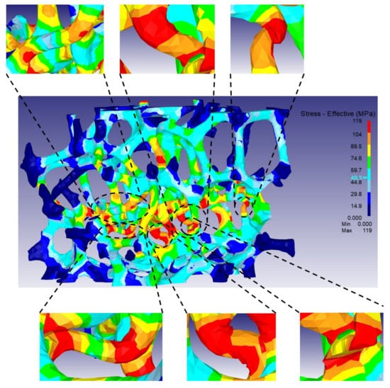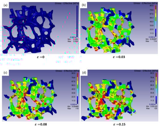 Figure 8 shows stress distributions at the end of the stress drop ( = 0.15), which is computed from the microstructural model of Specimen 1 with a porosity of 92.2%. Similar to the experimental behavior, various struts in the center of the model are buckled along the vertical direction during compression. The struts with buckling usually possess high stress values.