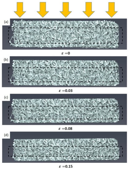 Figure 10 shows the observed microstructural evolution of a selected small geometry of interest to trace bending and buckling of Specimen 1 in detail. Notably, the micro-bending and buckling mechanism of the open-cell Ni foams was identified using the small geometry of interest. The struts aligning with the compression direction were bent and buckled during compression. With an increase in strain, struts inside the small geometry of interest were bent and squeezed. Beyond a strain of 0.15, dense collapse of struts was expected with an increase in strain.