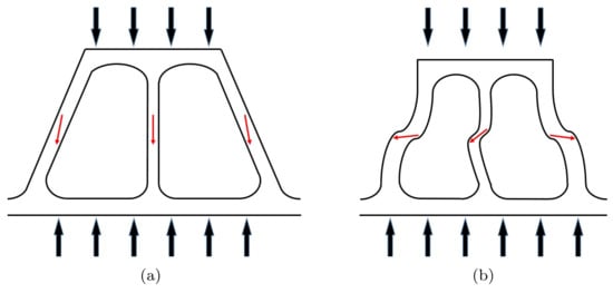 Combined approaches using X-ray CT and FEM are useful for evaluating compressive mechanical responses of foam materials. Here, bending and bucking of struts of Ni foams are simply illustrated, based on experiments and numerical predictions. Figure 12 is a schematic diagram that presents the deformation procedure of structural struts during compression. Structural struts aligning with the loading direction mainly experience and accommodate most external loading. In particular, the regions with red arrows frequently are bent under compressive loading. When bending occurs in the transverse direction, as specified with red arrows, a stress drop occurs. This bending mechanism is more likely to occur when the slenderness ratio increases.
