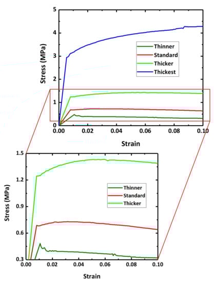 The predicted stress–strain curves of each model obtained by FE simulation are displayed in Figure 13. A stress drop does not occur in the thickest model. The other three models with thinner, standard, and thicker struts reveal minor stress drops. The degree of the stress drop increases with a decrease in thickness of the struts, and the stress drop occurs when the struts are thin. Note that the thinner the struts are, the higher the slenderness ratio is.