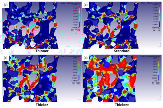 Distribution of effective strain of various model domains with different strut thickness at a macroscopic strain of 0.1: (a) thinner, (b) standard, (c) thicker, and (d) the thickest models.