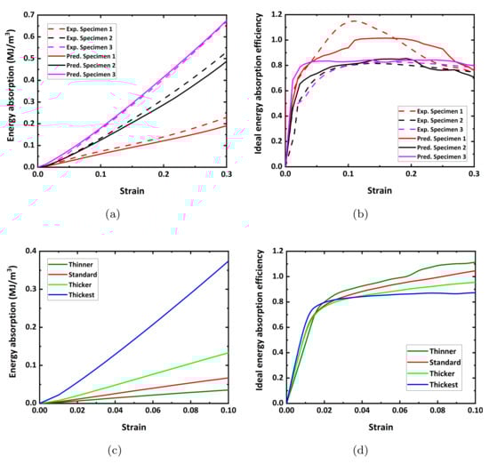 (a) Energy absorption and (b) ideal energy absorption efficiency of experiments and predictions according to different porosity. (c) Energy absorption and (d) ideal energy absorption efficiency of various model domains with different strut thickness.