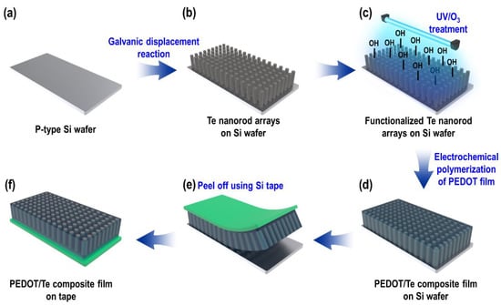 A PEDOT layer was synthesized by electrochemical polymerization, wherein the conducting polymer was deposited from an electrolyte containing the monomer and solvent onto a conducting substrate. Before electrochemical polymerization, ultraviolet light/ozone (UV/O3) surface treatment was carried out on the as-synthesized Te nanorod array for 50 s (Model #42, Jelight Co., Ltd., (Irvine, CA, USA) (Figure 1c), to remove the organic impurities and improve the wettability by incorporating oxygen-containing groups on the surface [22,23].