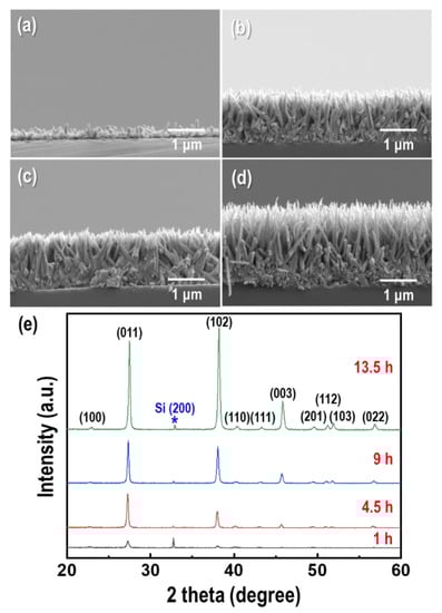 Galvanic displacement reaction (GDR) time dependence of the morphology and dimensions of the Te nanorod arrays. Cross-section field emission scanning electron microscopy (FE-SEM) images of Te nanorod arrays form at (a) 1 h, (b) 4.5 h, (c) 9 h, and (d) 13.5 h, respectively. (e) Corresponding X-ray diffraction (XRD) patterns of the Te nanorod arrays.