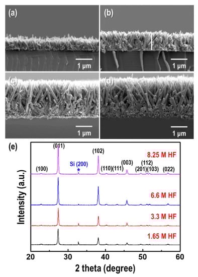 Hydrofluoric acid (HF) concentration dependence of the morphology and dimensions of the Te nanorod arrays. Cross-section FE-SEM images of the Te nanorod arrays formed at HF concentrations of (a) 1.65 M, (b) 3.3 M, (c) 6.6 M. and (d) 8.25 M, respectively. (e) Corresponding XRD patterns of the Te nanorod arrays. The concentration of TeO2 and GDR time were fixed at 1.5 mM and 9 h, respectively.