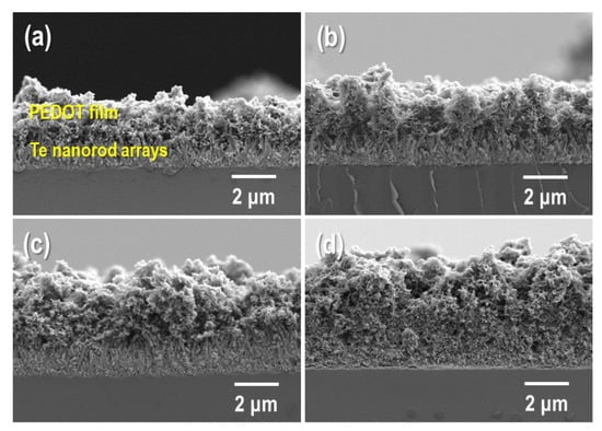 Cross-sectional FE-SEM images of the PEDOT/Te composite films synthesized by electro-polymerization with various polymerization times are shown in Figure 4. When the polymerization time was short (10 s), only a few PEDOT with island structures were deposited in the Te nanorod layer (Figure S2), which disturbed the complexation between PEDOT and the Te nanorod array. As the polymerization time increased to 15 s, a PEDOT layer with a film shape was observed, indicating good deposition of PEDOT onto the Te nanorod array. The thickness of PEDOT increased with increasing polymerization time. For comparison, we also prepared a PEDOT:PSS/Te composite film, in which the Te nanorod array was coated with PEDOT:PSS using a spin-coating method. The resulting composite film had many voids between the PEDOT:PSS and Te nanorod arrays (Figure S3), which caused a decrease in thermoelectric performance.