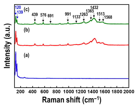 Raman spectra of (a) Te nanorod arrays, and PEDOT/Te composite films with polymerization time of (b) 15 s and (c) 30 s.