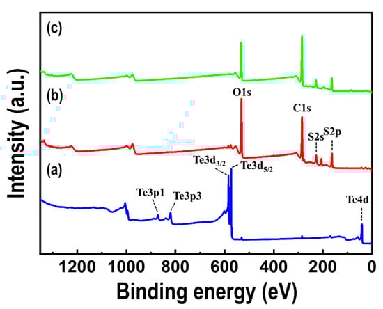 X-ray photoelectron spectroscopy (XPS) spectra of (a) Te nanorod array, (b) PEDOT/Te composite film with polymerization time of 15 s, and (c) PEDOT film.