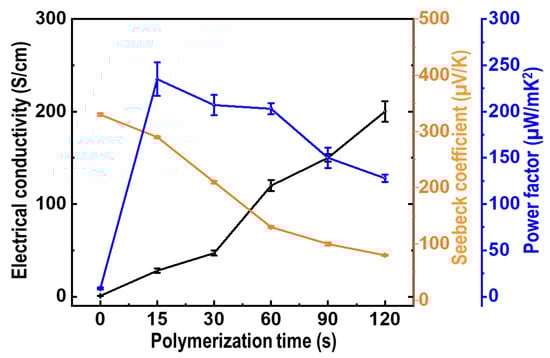 Based on the XRD, Raman, and XPS results, the coexistence of Te nanorods and PEDOT components in the composite films was confirmed. The thermoelectric performance of the PEDOT/Te composite films as a function of the PEDOT polymerization time is shown in Figure 8. The σ value of the PEDOT/Te composite films increased as the PEDOT polymerization time increased from 15 to 120 s. The high σ value was attributed to the fact that the Te nanorod array filled with PEDOT, which improved the electrical conductive pathway in the composite films. Furthermore, the σ value of PEDOT was higher than that of the Te nanorod, because its semi-metallic character originated from the high doping concentration of the PEDOT film, which was grown by electro-polymerization with oxidation potential [34]. Moreover, they exhibited p-type semi-metallic behavior and combined into a double-layer structure with a good ohmic contact at the interface between the two phases, which was conducive to the extraction and transmission of high-energy carriers. At a lower PEDOT polymerization time (at 10 s), PEDOT was deposited onto the Te nanorod array and was not well interconnected with the island structure, which caused disconnection of the PEDOT, inhibiting the increase in the σ value of the composite film. Upon prolonging the PEDOT deposition time, the σ value of the composite film dominated that of PEDOT, and an increase in the σ value was observed.