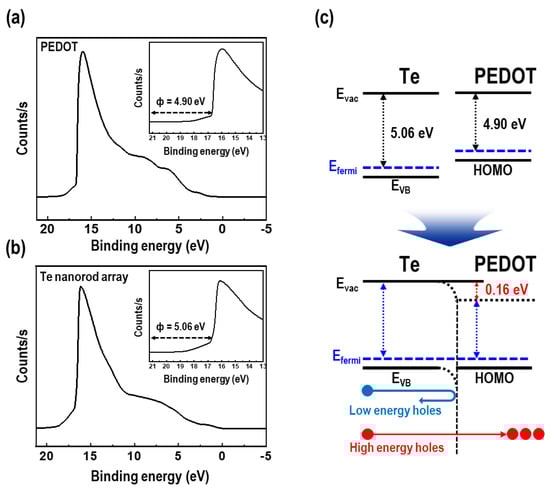 where Φ is the work function, hν is the He (I) excitation energy (21.22 eV), and Ecut-off is the secondary electron cut-off. This results showed that the work functions of PEDOT and Te nanorod array was revealed as 4.90 and 5.06 eV, respectively (Figure 9a,b). The work function of the Te nanorod array shown in this study was slightly higher than that of previously reported Te [41,42,43]. This was due to the effect of surface treatment of Te nanorod arrays with UV/O3 treatment, which is one of the most common ways to increase the work function, caused by oxidation of the surface [44]. As a result, a potential barrier with a height of ~0.16 eV was formed near the interface between the PEDOT and Te nanorods. A potential barrier height of a few hundreds of meV is recognized as an optimized barrier height to improve the S value according to theoretical studies [45]. An effective potential energy barrier was formed between the PEDOT and Te nanorods, filtering holes with energy less than the potential barrier height, while passing holes with high energy at the interface. It is necessary to filter the holes with lower energy because they serve negatively to the S value [42], resulting in decreased thermoelectric performance. In other words, the separation of hot and cold energy holes by introducing a potential barrier can help improve the S value in organic-inorganic composite systems.