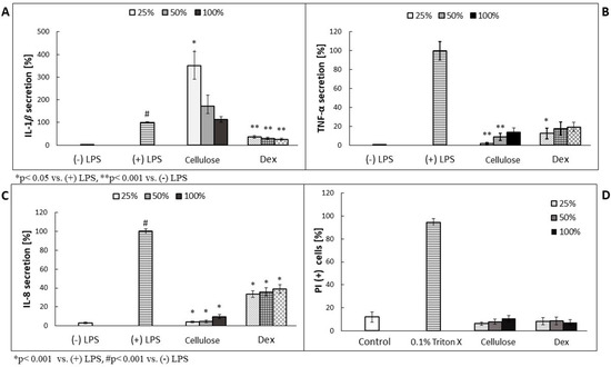 Prior performance of the assessment of antimicrobial effectiveness of plant metabolite-enriched BC, we analyzed their effect on the cytokines secretion using LPS-stimulated human neutrophil-based model experiments, because NC version of carrier contained bacterial cells’ leftovers which could induce the activity of the examined immune cells. As shown in Figure 3B,C, TNF-α and IL-8 secretion was decreased in a concentration-dependent manner. In case of IL-1β, the overproduction was observed, but its values decreased along with the higher cellulose concentration used (Figure 3A). The most effective, in terms of TNF- and IL-8 secretion inhibition, was four times diluted cellulose (25%), which released less than 10% of the cytokines, compared to (+) LPS-treated cells. No cytotoxic effect was observed on neutrophils (Figure 3D).