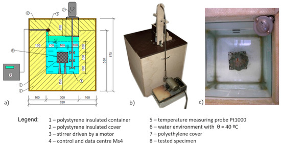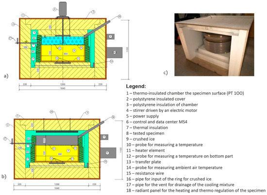 The thermal physical parameters (specific heat capacity and thermal conductivity coefficient) were determined in the laboratory using calorimetry of own construction (Figure 1a) and the method of determining the freezing time interval of the structural layer, see Table 2. The methodology of determination of specific heat capacity (Figure 1) and thermal conductivity coefficient (Figure 2) was described in detail in [98,99].