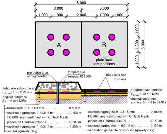 In terms of construction, the experimental field is divided into two segments (A, B), which are distinguished by different values of bearing capacity at the level of the subgrade sub-surface and the resulting different thickness values of the composite layers of foamed concrete. The subgrade sub-surface in the structure is the surface of the layer of crushed aggregate that was applied to the original subgrade surface. Segment A is characterized by the deformation-resistant subsoil, where conditions of satisfactory bearing capacity of the subgrade were expressed at the level of the subgrade sub-surface, expressed by the value of static modulus of deformation E0,sub = 40 ± 2 MPa, while a 10 m thick composite layer of foamed concrete was embedded in the sub-ballast layers construction. Segment B is characterized by a low deformation-resistant subsoil, where at the level of the subgrade sub-surface conditions of unsatisfactory bearing capacity were created, expressed by the value of static deformation modulus E0,sub = 10 ± 2 MPa, while a 0.15 m thick composite layer composed of foamed concrete was built into the structural composition of sub-ballast layers. The deformation modulus was determined by using Plate Bearing Test Equipment 100 kN (Fröwag GmbH., Obersulm-Eschenau, Germany) according to regulation TS4 [100] diameter of 300 mm. In order to protect the composite layer of foamed concrete from mechanical damage due to the pushing of the particles of ballast bed into its surface (due to the effects of dynamic effects from the passage of trains), a protective layer of crushed aggregate of fraction 0/31.5 mm was established on its surface. In segment A, in contrast to segment B, a ballast bed layer composed of gravel of fraction 31.5/63 mm is established on the sub-ballast layers. A built-in protective tube for the hygrometer (blue rectangle in Figure 3) together with Pt1000 temperature sensors (red circles in Figure 3) were also installed in Segment A, as this segment also serves to obtain input parameters for numerical modelling of the thermal regime of the substructure.