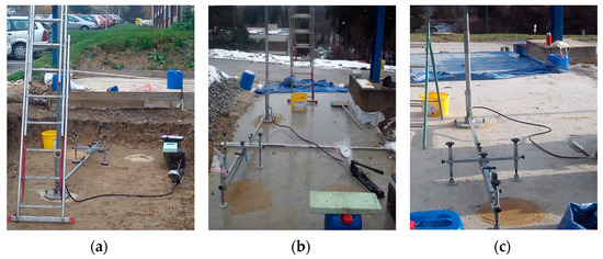Experimental field—load capacity test on (a) the subsoil, (b) layer of foamed concrete, and (c) ballast bed.