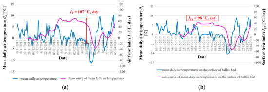 Within the experimental field, specifically in segment A, the freezing of the railway structure (freezing depth DF) is monitored by means of five Pt1000 temperature sensors (Figure 1) located in the axis of segment A. Temperature sensors which are built into five different construction levels (surface of the ballast bed, sub-ballast upper surface, top and bottom surface of the composite layer of FC, surface of the original subgrade), record the instantaneous temperature with a periodicity of 30 min. Another temperature sensor is located 2.0 m above the surface of the surrounding terrain and is used to measure the air temperature, which is needed for the subsequent determination of the air freezing index IF and the average annual air temperature θm. So far, four winter periods have been recorded in the experimental field and their determined thermal parameters (θs,min—minimum mean daily air temperature during the winter period, θm—average annual air temperature, IF—air freezing index, IFs—surface air freezing index, DF—depth of freezing of the railway line structure) are given in Table 3.