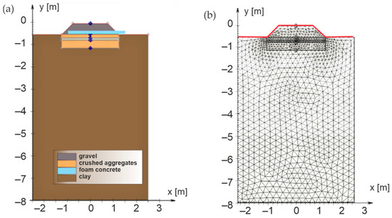 In the first case (model No. 1, see Figure 11a), the sub-ballast layers, a 0.20 m thick composite layer of FC was designed for the width of the active zone of the traffic load (2.50 m from the axis of track) in combination with the layer of crushed aggregate fraction 0/31.5 mm. Moreover, the sub-ballast upper surface was designed as a horizontal and the subgrade surface with a roof slope of 5% (the most common case in the administration of the Slovak Railways [87]).