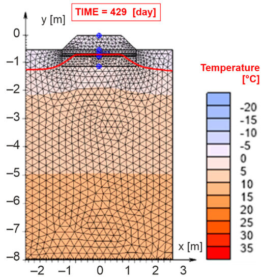 In order to validate the numerical model, the thermal results of the experimental and numerical methods were compared. The values of the maximum air freezing index as well as the maximum freezing depth of the railway structure were reached on 5 March 2018, which in the numerical model represents the day TIME = 429 day. Figure 9 presents the maximum freezing depth of the structural layers DF,max = 0.690 m (marked by a red curve) obtained in the numerical model.