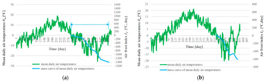Graphical representation of selected climate characteristics used for numerical modelling air freezing index IF = 1400 °C, day and average annual air temperature θm = 2 °C (a), IF = 600 °C, day and θm = 6 °C (b).