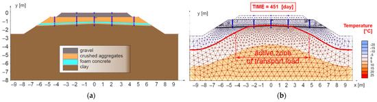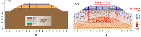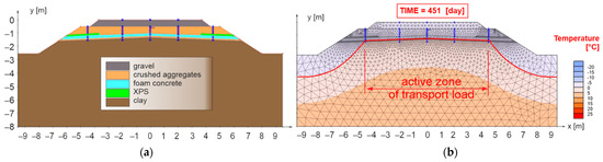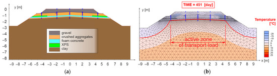 Figure 11b presents the results for the 451st day of numerical model No. 1, when the maximum freezing depth of the railway structure was reached (the zero-degree isotherm is highlighted by a red curve). It can be observed that the proposed thickness of the reinforcing and at the same time thermal insulation layer of FC is sufficient from the point of view of thermal insulation in the area of the axis of the subgrade of the double-track. In this case, however, there is a partial freezing of the subgrade surface in the area of the axis of the individual tracks and a significant freezing at the end of the active zone of the traffic load (approximately 2.50 m from the track axis). For these reasons, the numerical model No. 2 (Figure 12a) was created, where a composite layer of FC (reinforcing and at the same time thermal insulation layer) was placed on the levelling layer of the subgrade up to the face of the slope of the embankment.